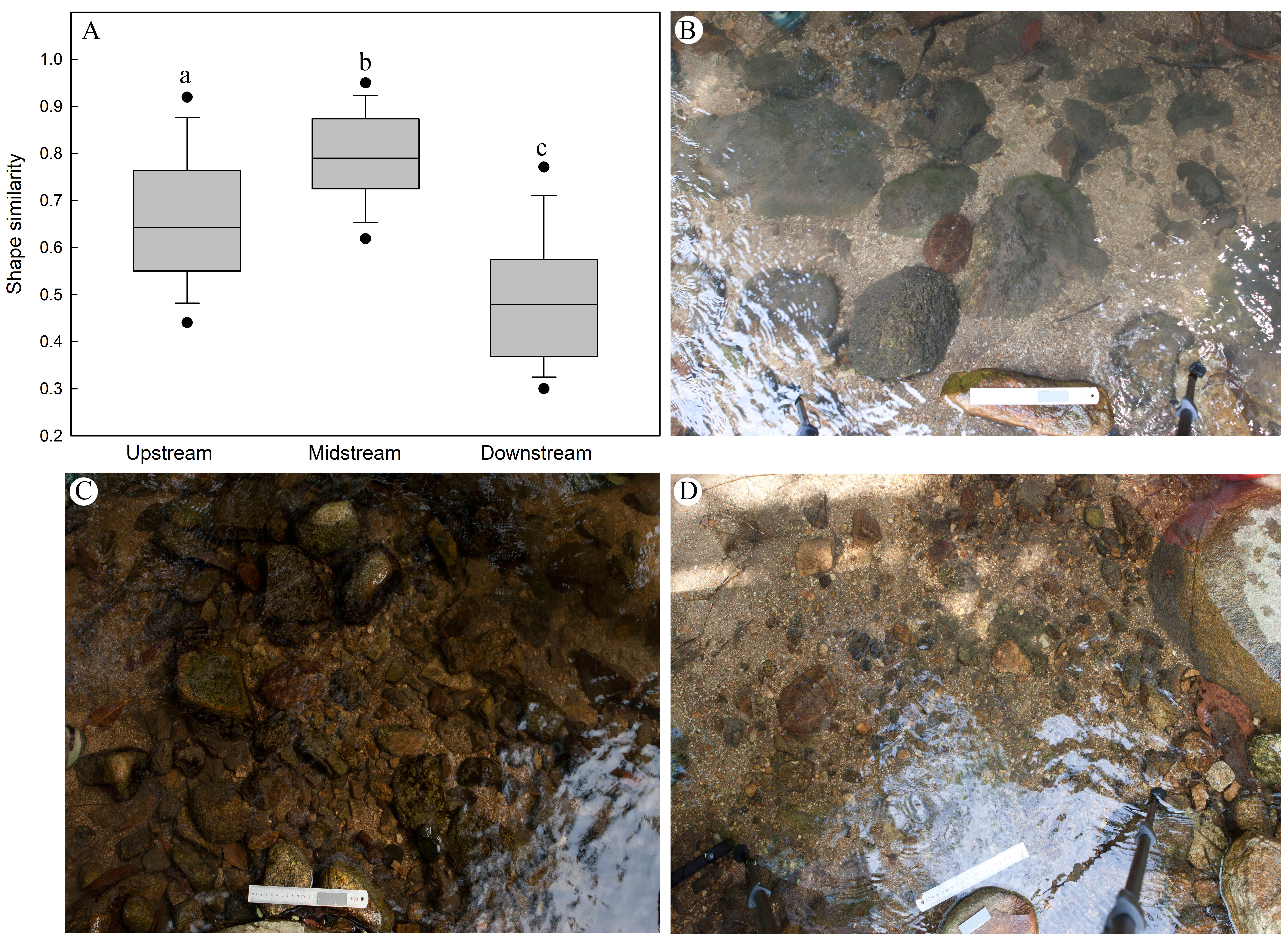 图2 四眼斑水龟与溪流中石块的形状相似度(A)及其上中下游生境(B,C,D)(Xiao et al.,2021)